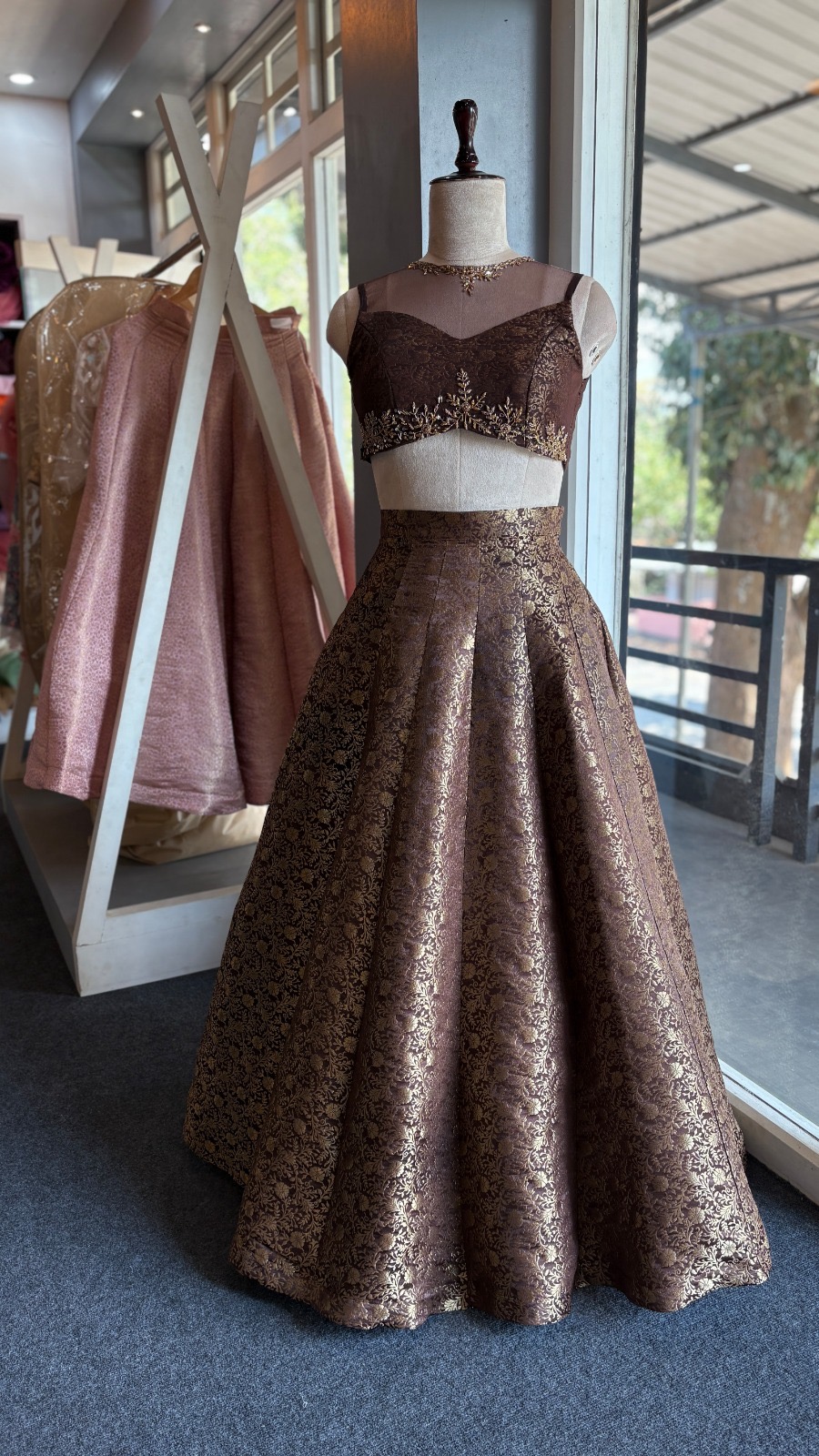 Blush pink color satin banarasi panel skirt with pure raw silk blouse embellished with hand work
